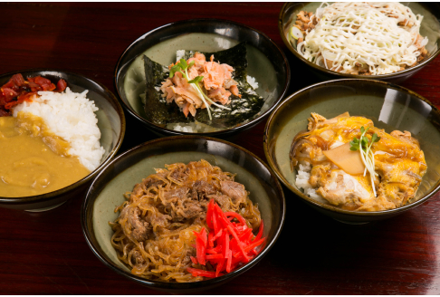 玉子丼・鮭丼・カレー丼・牛すき丼・ねぎチャーシュー丼・とり鶏天丼・野菜天丼